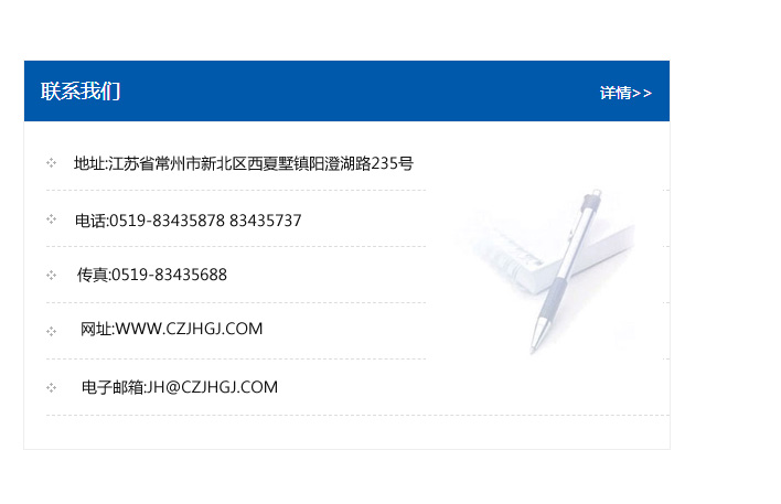 傳真:0519-83435688    郵編:213135    網址:WWW.czjhgj_com.gsylqx.com    電子郵箱:JH@czjhgj_com.gsylqx.com